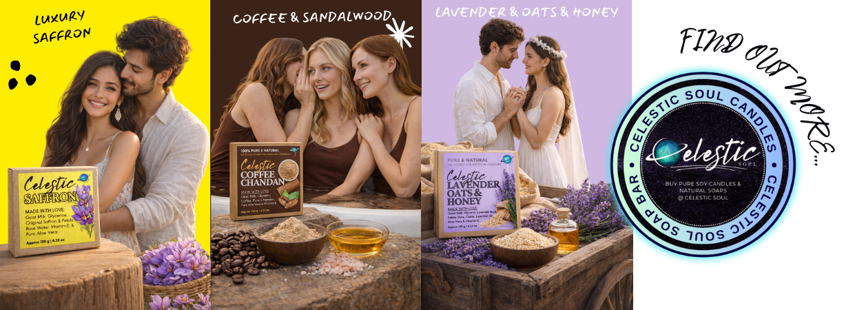 Discover the essence of nature with Celestic Soul Soaps, crafted with organic goat milk, aloe vera, natural glycerine, vitamin E, sandalwood, saffron, coffee, salt, fuller's earth, edible oats, honey, and premium botanical essential oils. Our soaps are premium and natural, paraben-free, SLS-free, cruelty-free, and suitable for all skin types. Each bar offers deep moisturisation, skin brightening, acne cleansing, and soothing care, making it perfect for everyday luxury skincare.
